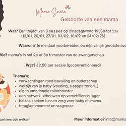 Zit je in je 2e of 3e trimester van je zwangerschap en ben je benieuwd naar wat er allemaal zal komen? Wat mag je verwachten van het ouderschap? Hoe kan je u mentaal voorbereiden? Wij voorzien een traject van 6 sessies waarin we je klaarstomen voor één van de grootste avonturen. We behandelen volgende thema's: - verwachtingen rond bevalling en ouderschap - welzijn van je baby (voeding, slaappatronen, dragen...) - eigen emotionele rollercoaster (de impact van hormonen, slaapgebrek...) - een netwerk uitbouwen op verschillende lagen (relationele impact en verschuivingen) - balans zoeken tussen zorg voor baby en mama - terugkom moment met een vragenuur voor de collega's (vroedvrouw, slaapconsulent en psycholoog) Krijgt je partner ook graag informatie uit eerste hand of denkt deze graag mee na over hoe jullie gaan afstemmen dan is hij/zij uiteraard welkom!