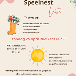 Ben je op zoek naar tijd en ruimte om samen met je peuter of kleuter te spelen zonder alle afleiding van huishoudelijke taken? Wil je exploratie, groei en zelfstandigheid leren bevorderen? Kom dan samen met je kleintje(s) naar de speelgroep. Er is begeleiding voor wanneer er vragen zijn, iemand nood heeft aan een adempauze/perspectiefverruiming of gewoon een gezellige babbel... In 2026 voorzien we elke maand een themasessie tijdens het weekend of een vakantieperiode. Reeds geplande momenten: - zo 11 januari : Winterpret - woe 18 februari (krokusvakantie): Carnaval - zo 29 maart: Pasen - zo 26 april: Lente - zo 17 mei: boerderij - zo 28 juni: vakantie Voor €20 per (groot)ouder-kind voorzien wij: - een leuke voormiddag met 2 uur verbindingstijd - speelgoedrotatie op leeftijd en ontwikkeling - een hapje en drankje - knutsel en/of beweegactiviteiten - tijd om vragen te beantwoorden Kom je met meerdere kindjes, geen nood de prijs verdubbelt niet. Er is een kleine meerprijs van €5 per kindje. Broers of zussen <1 jaar komen gratis mee. Wees welkom!