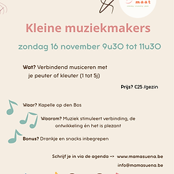 Tijdens deze sessie zetten we in op ouder-kind verbinding door middel van muziek maken. Nele neemt jullie mee in een super toffe en interactieve workshop waarbij jullie samen kunnen musiceren en spelen. De workshop duurt 2u. Het eerste half uur hebben jullie rustig de tijd om toe te komen, mekaar te leren kennen en vrij te spelen of kennis te maken met het materiaal. Daarna zal Nele jullie een uur meenemen in allerlei leuke activiteiten waarbij verbinding en plezier centraal staan. Als afsluiter kunnen jullie opnieuw een half uur uitbollen in de speelruimte en genieten van een drankje en snackje in de keuken. Wij kijken er heel erg naar uit om jullie te ontmoeten, inspireren en entertainen. Tot binnenkort!